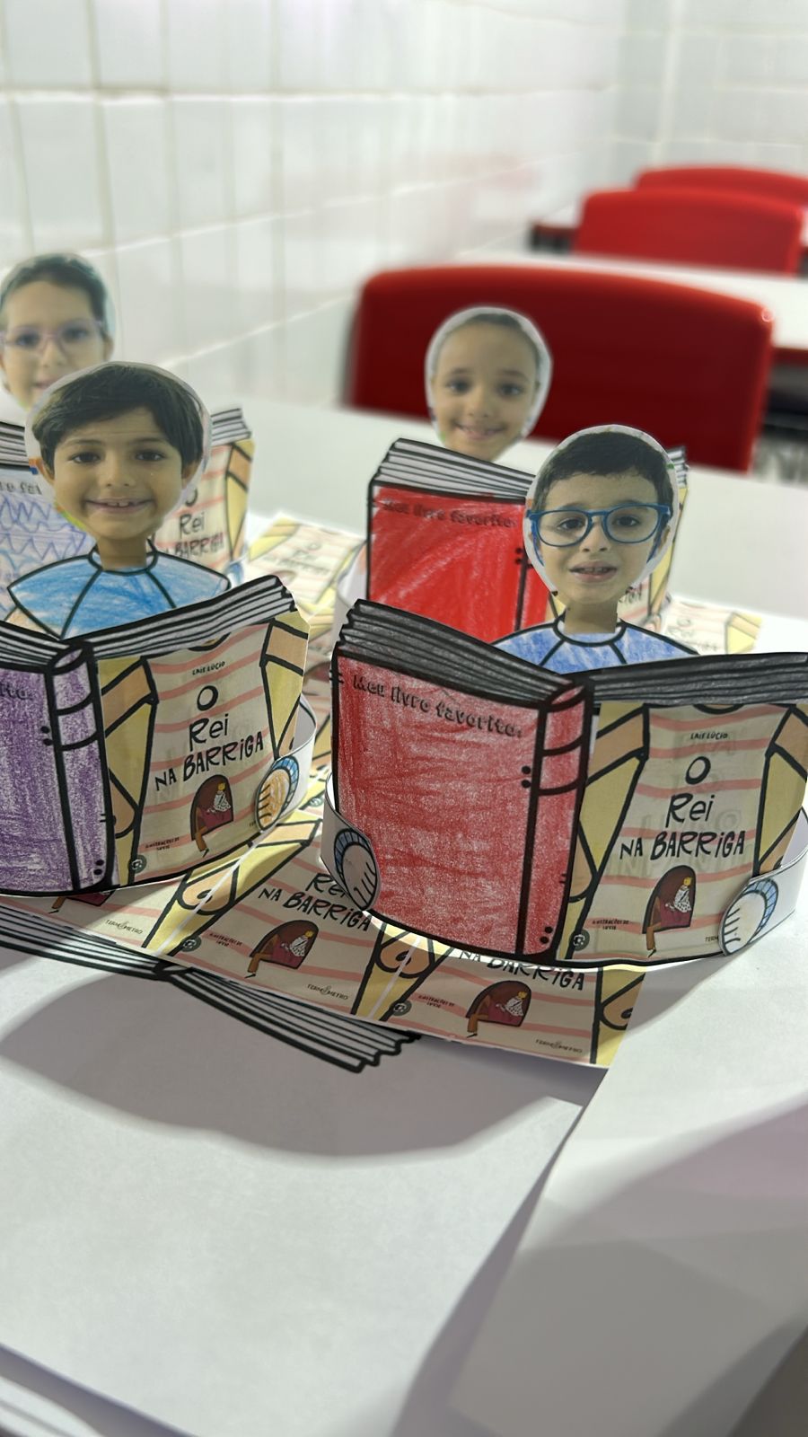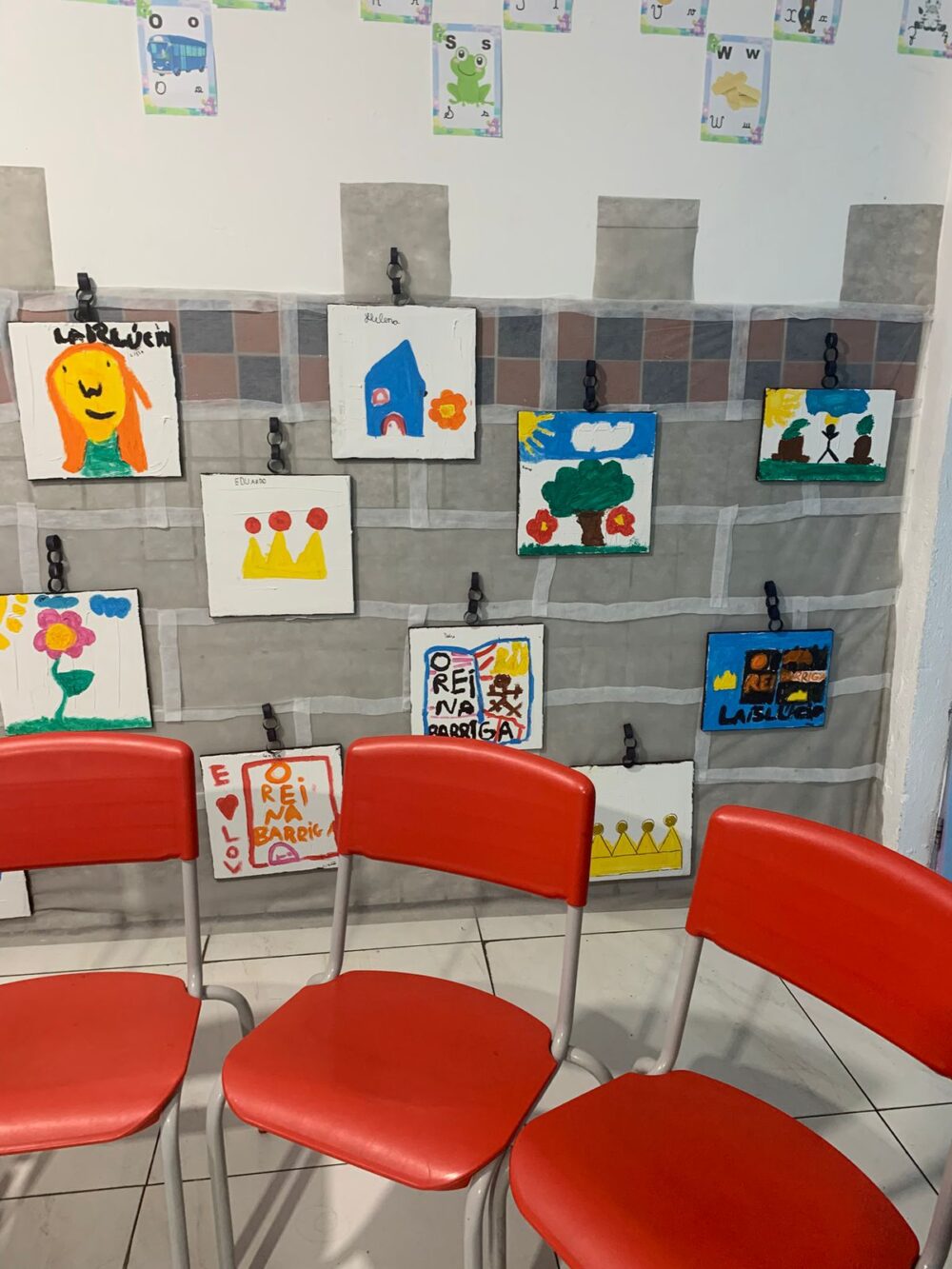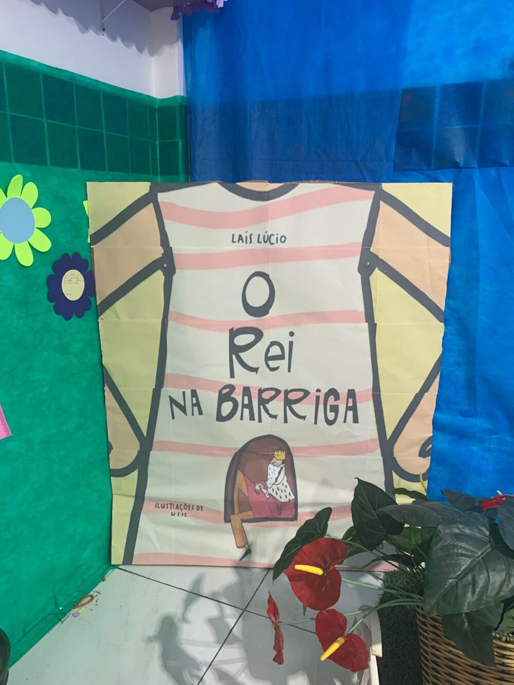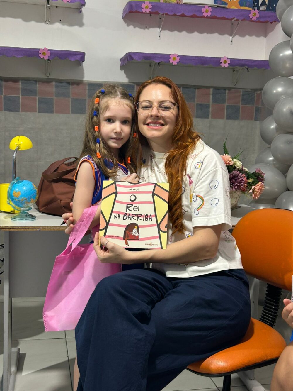 Durante a apresentação, as crianças se revezavam em grupos. A cada novo grupo de pais que chegava à sala, elas refaziam a apresentação, momento em que Lais Lúcio também compartilhava curiosidades e outras informações relevantes com os pequenos. Chegando ao final do evento, a autora autografou os exemplares de O rei na barriga, conversou com os alunos e a família, além de tirar fotos para registrar o momento especial.