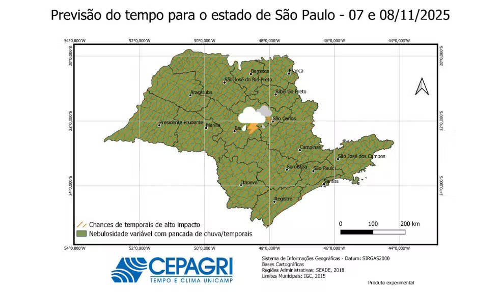 No estado de São Paulo, há condições para tempestades severas, com destaque para granizo isolado, raios frequentes e rajadas de vento extremas, além de microexplosões pontuais (são descargas violentas de ar que descem de nuvens de tempestade e atingem o solo em linha reta, espalhando ventos que podem ultrapassar 200 km/h).