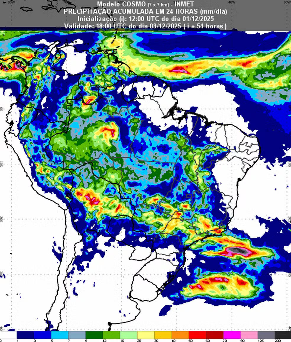 Até quinta-feira (4), as precipitações se concentram nos estados citados, mas a partir de sexta-feira ganham força no Centro-Oeste — especialmente entre Mato Grosso e Goiás —, no centro-norte de Minas Gerais, Espírito Santo e Bahia.