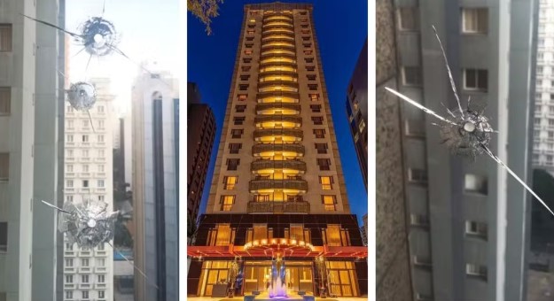 Imagens de câmeras de segurança internas do hotel, obtidas pela reportagem, registraram o exato momento em que um dos tiros perfura o vidro temperado do 16º andar. Fotos que circulam nas redes sociais mostram os vidros crivados de buracos nos três andares atingidos: dois disparos no 15º, cinco no 16º e um no 17º. O prédio tem 20 andares no total.