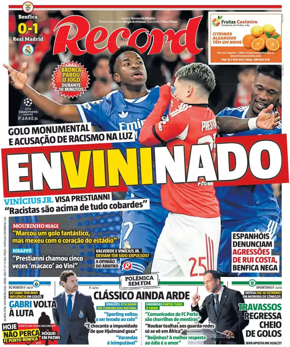 A vitória do Real Madrid por 1 a 0 sobre o Benfica, no Estádio da Luz, em Lisboa, colocou Vinícius Júnior no centro das atenções da imprensa internacional. O brasileiro marcou o gol decisivo da partida com um golaço no segundo tempo e, logo em seguida, denunciou ter sido vítima de racismo por parte do jogador Prestianni, o que gerou ampla cobertura e manchetes destacadas em diversos países.